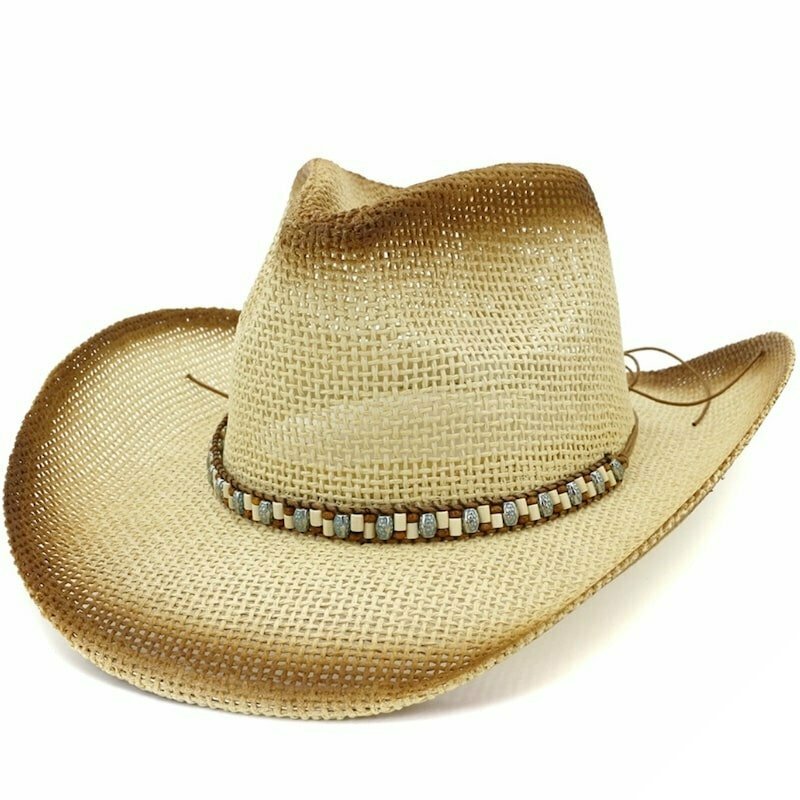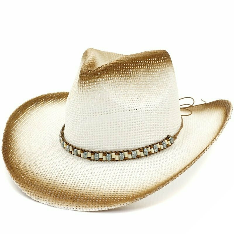 Halmstrå hatten til kvinder er et karakteristisk model fra den vestlige cowboy verden. Den skiller sig ud med charme og elegance med sit raffinerede fletværk og perlekæde. En uundværlig accessory for vestlige entusiaster.