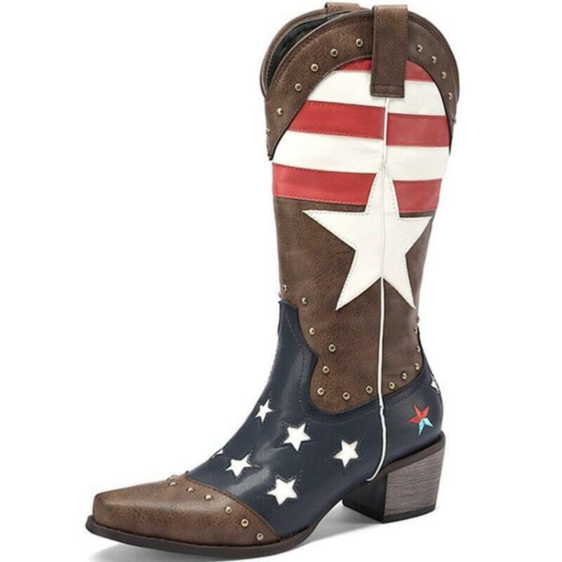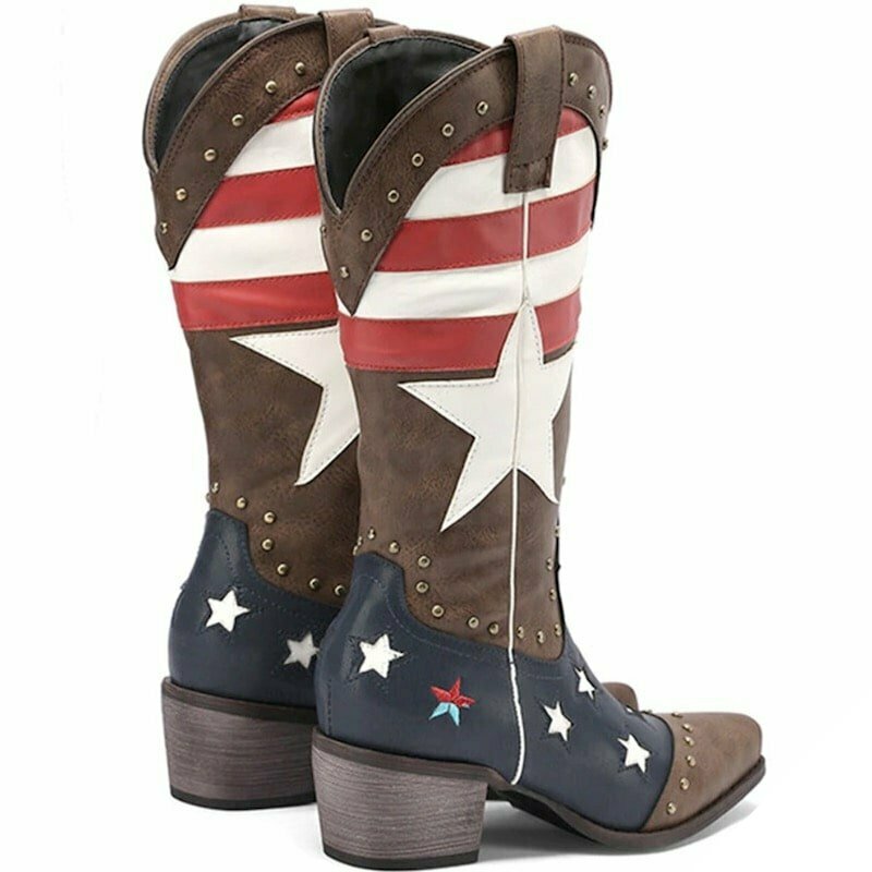 Pigerstøvler er charmerende og autentiske inden for western-stil. Disse håndlavede støvler med udseende af læder har stilfulde manchetknapper med et cowboy- og stjernemotiv under det amerikanske flag.