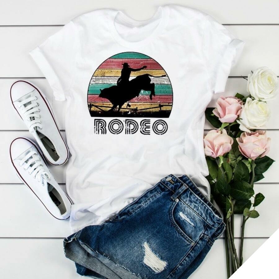 T-shirt cowboy Rodeo Las Vegas viser en mand, der rider en okse på en ranch. Et vintage t-shirt, der vil appellere til alle rodeo- og western-elskere.