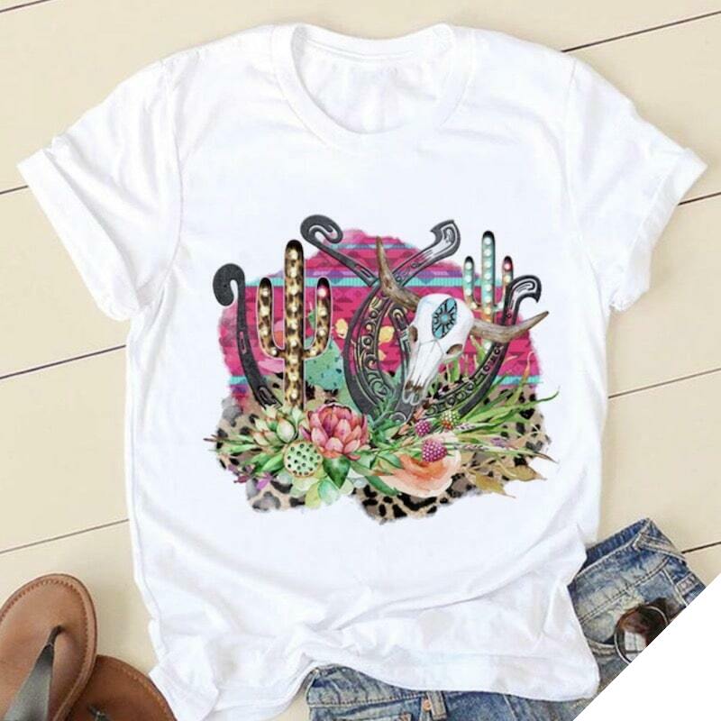 T-Shirt Country Flowers repræsenterer et kohoved, dekoreret med blomster på en bucolic måde, i det amerikanske vilde vests. Et t-shirt, der vil glæde alle naturelsker og western-elskere.
