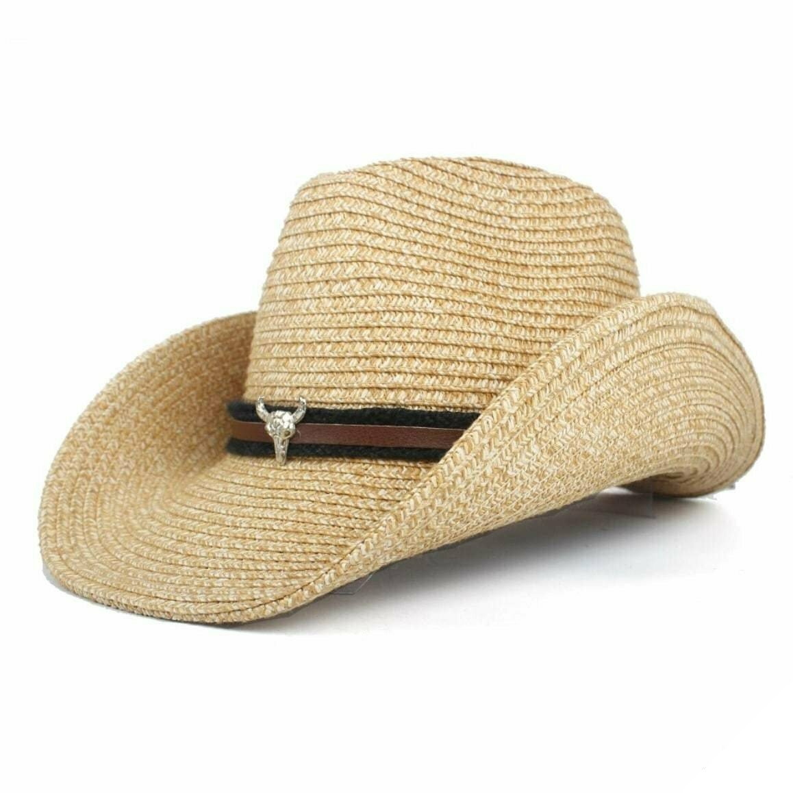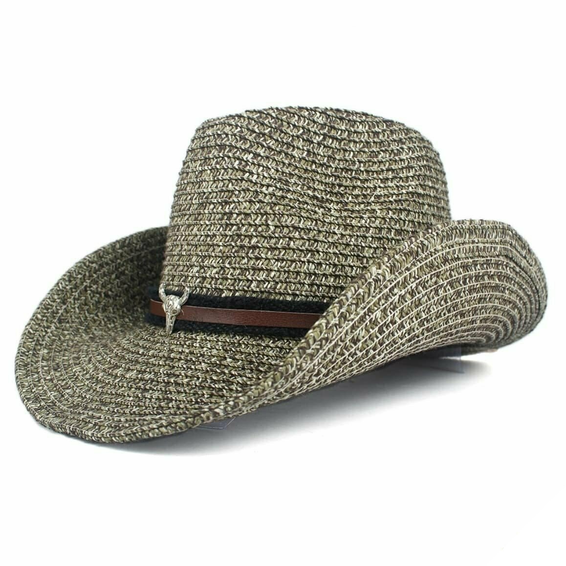 Denne fleksible pællækre cowboy hat er en ægte klassiker. Dens turkise farve, sammen med en elegant bånd dekoreret med et symbol af en bøffels kranium, vil glæde country-elskere.