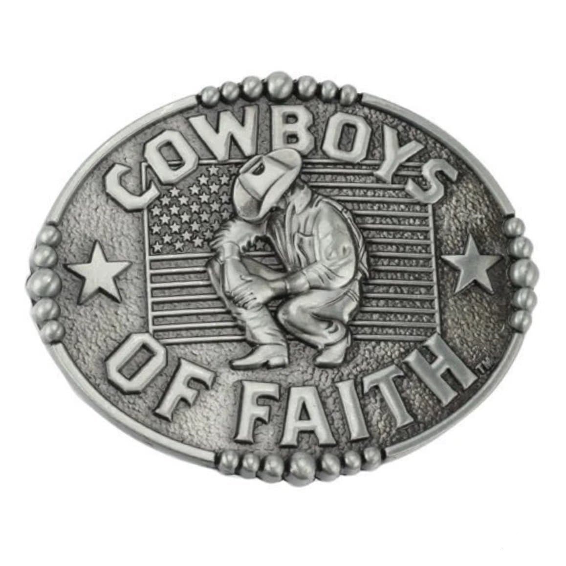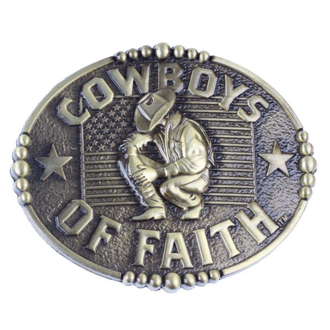 Bælte spændet Cowboys of Faith søger at fremhæve den hårde livsstil for cowboys. “Cowboys of Faith” symboliseres af cowboyen i forgrunden på et flag med det amerikanske emblem. Det er et ideelt spænde til de, der elsker Vilde Vesten.