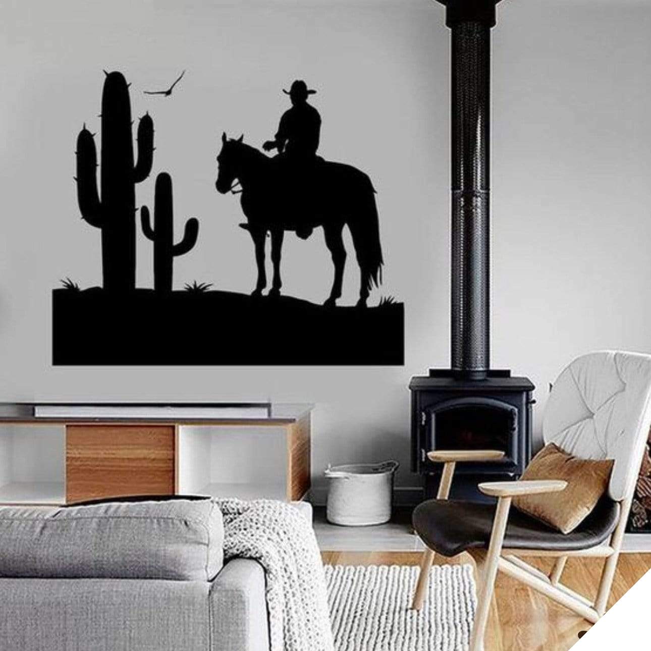 Dette smukke vægmaleri viser en cowboy ved solnedgang i det amerikanske Far West. Denne hollywood-inspirerede repræsentation vil forvandle dit hjem.