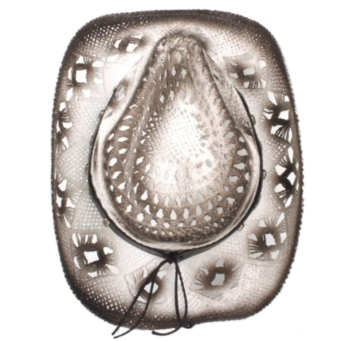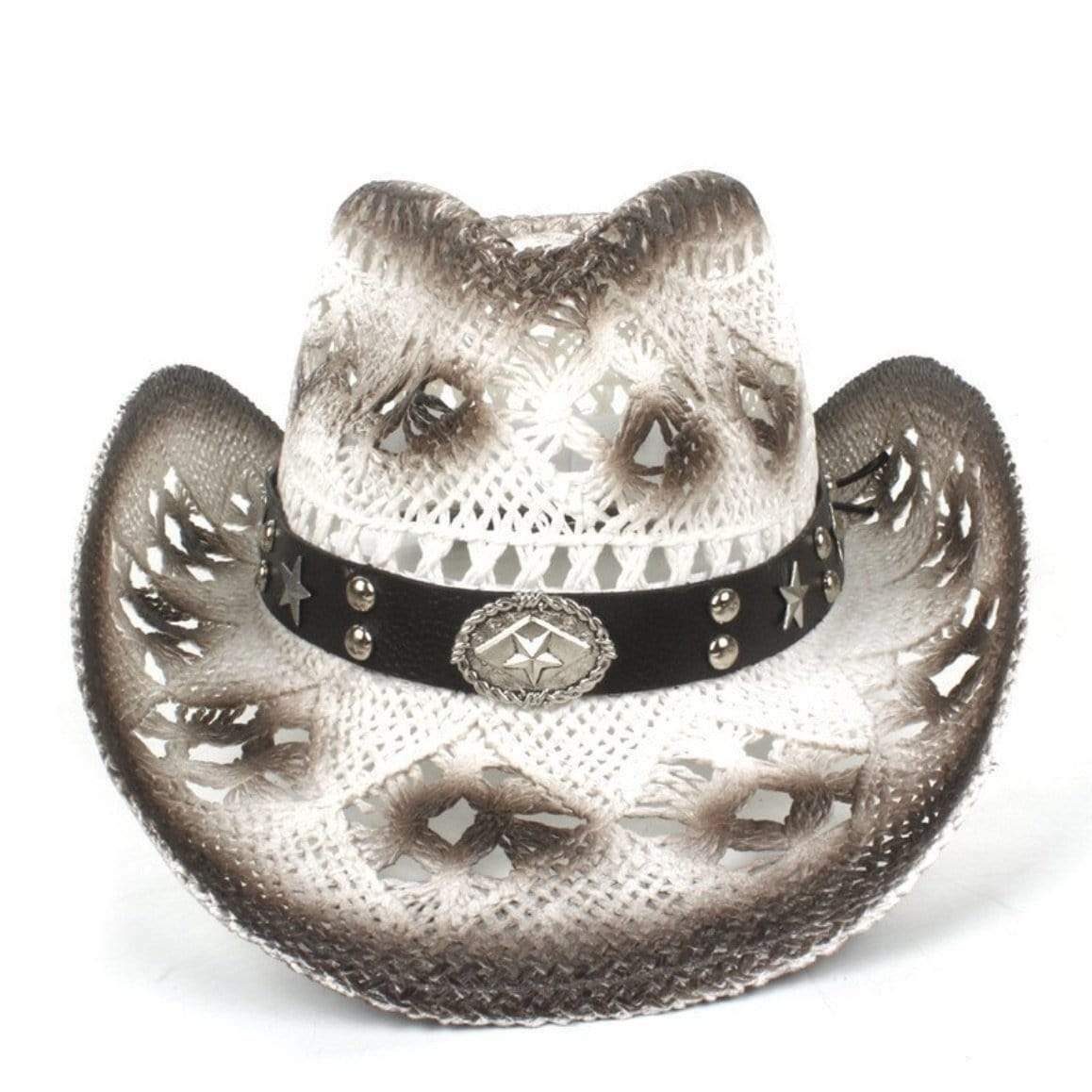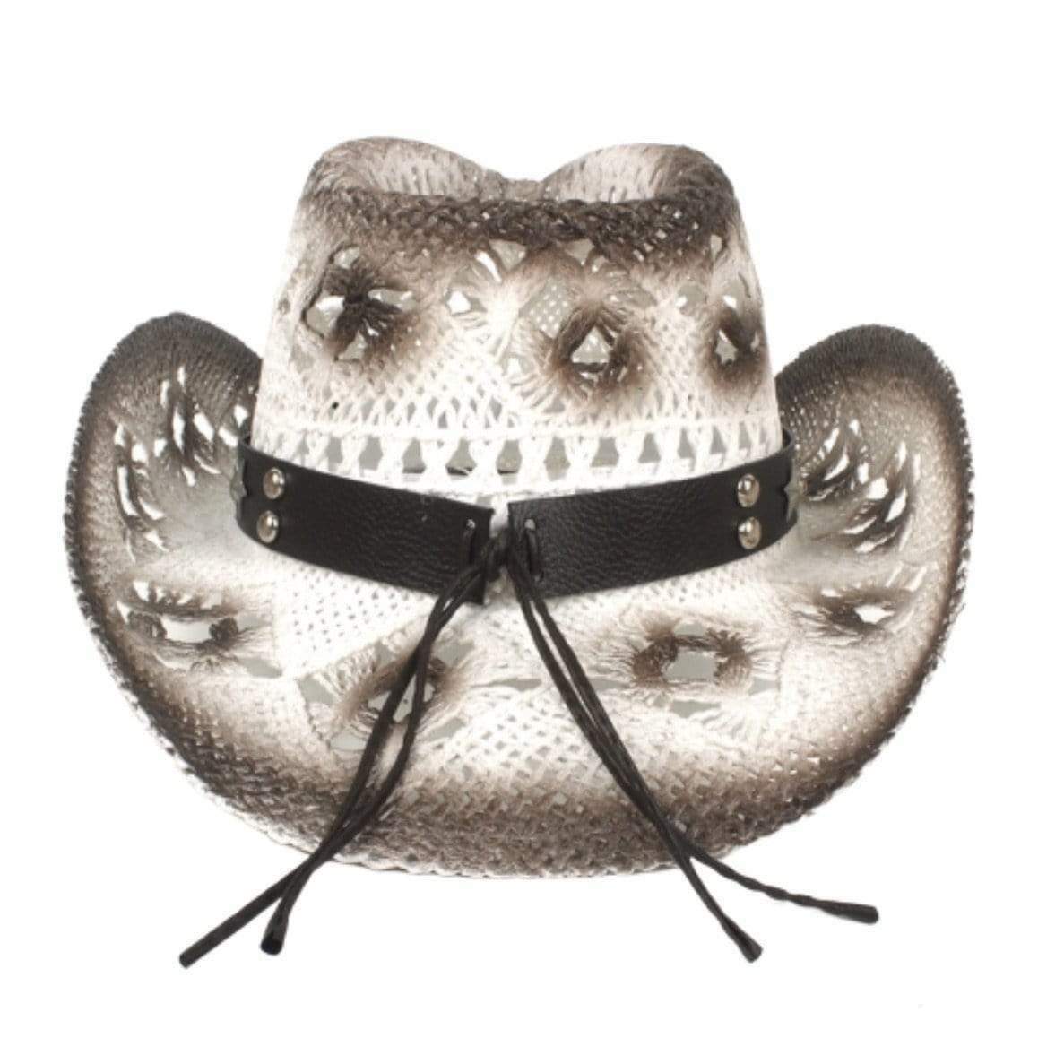 Den hvide westernhat til kvinder er ideel til at tackle sommeren med cowboy-stil. Den hvide og sorte strå og den ægte læderrem med stjerner, der symboliserer Vilde Vesten, vil ikke gå ubemærket hen blandt ægte westernentusiaster.