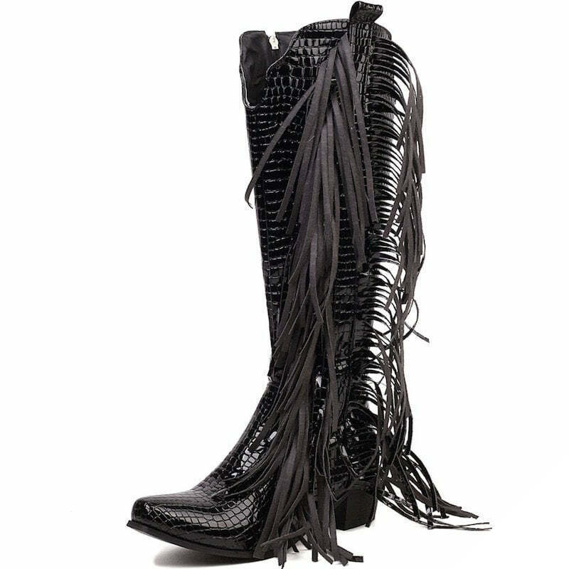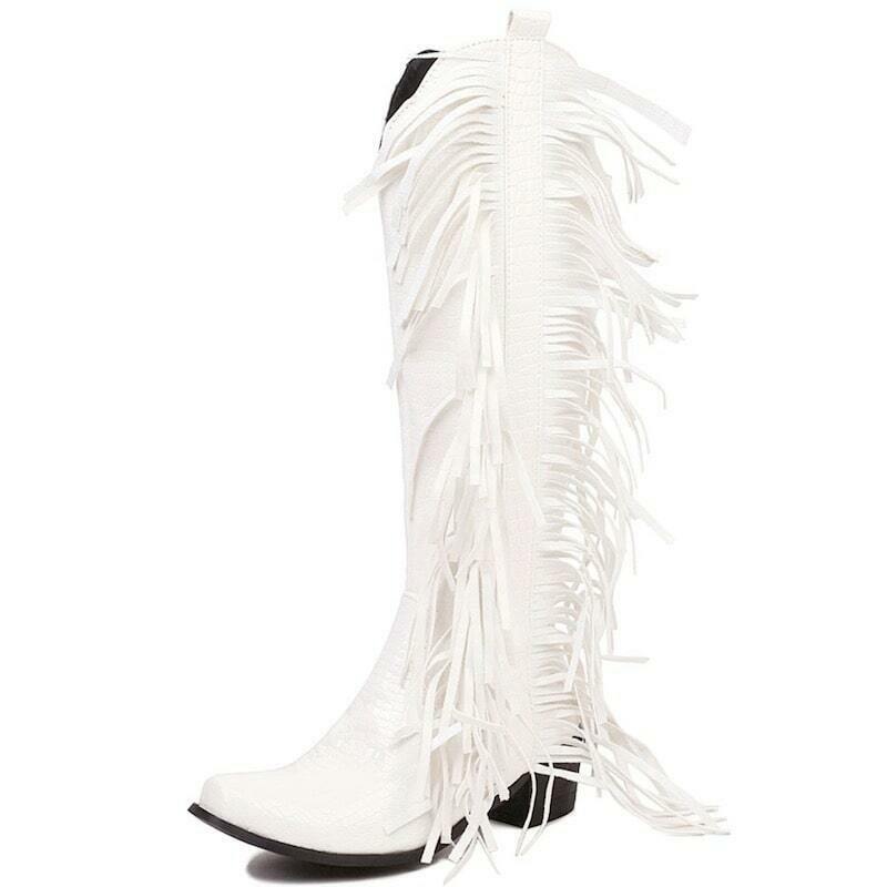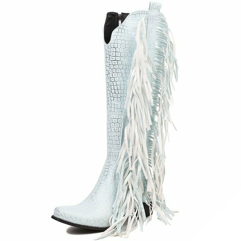 Vestlige damesko i hvid er en klassiker inden for cowboy-stilen. De er lavet af hvidt kunstlæder og skiller sig ud med deres karakteristiske frynser og krokodilleeffekt, der hører til i den vilde vesten.