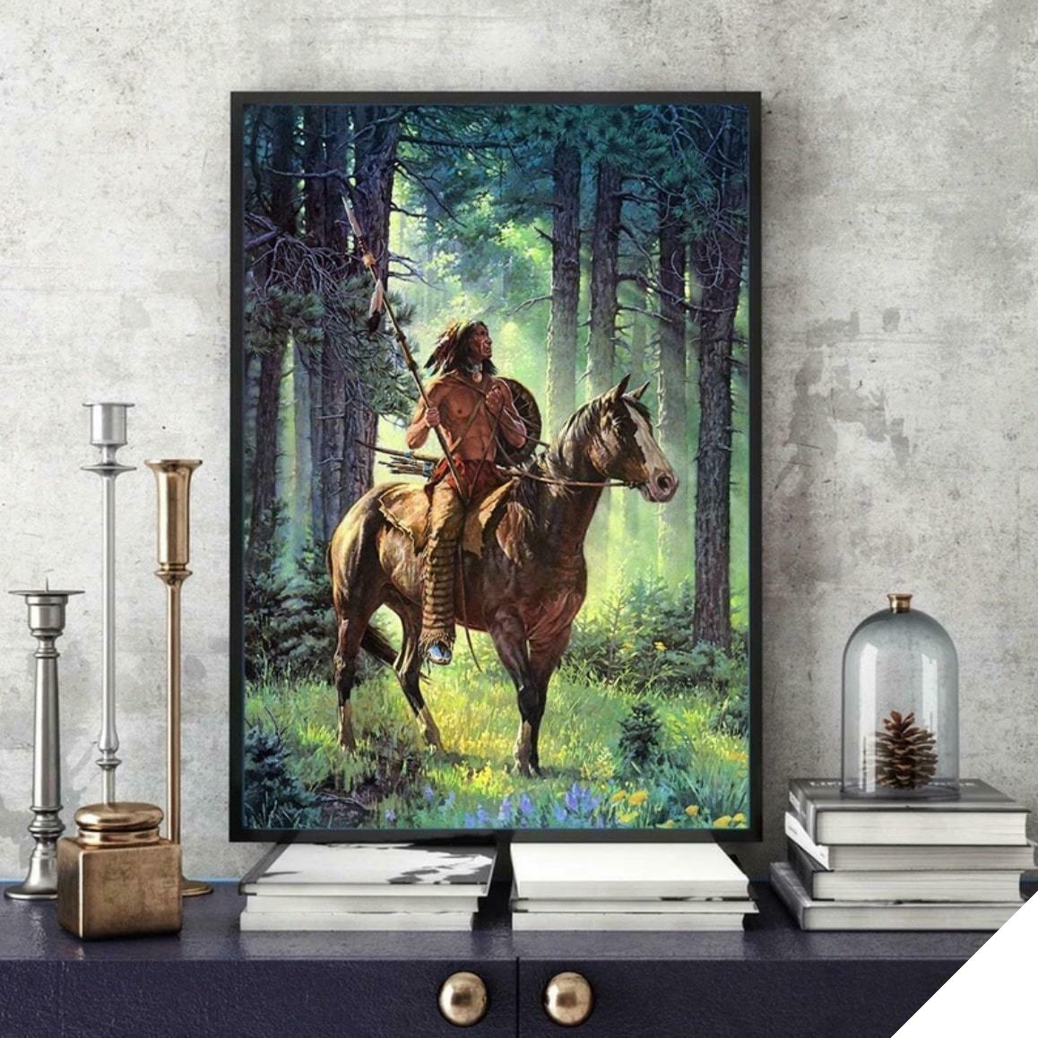 Det amerikanske indiske dekorationsbillede er en repræsentation af livet i hjertet af naturen, af Apache-indianerne. Dette maleri med sublime farvesammensætning viser mange detaljer og fremhæver en smuk hest samt den traditionelle påklædning af de amerikanske indianere midt i en nåleskov.
