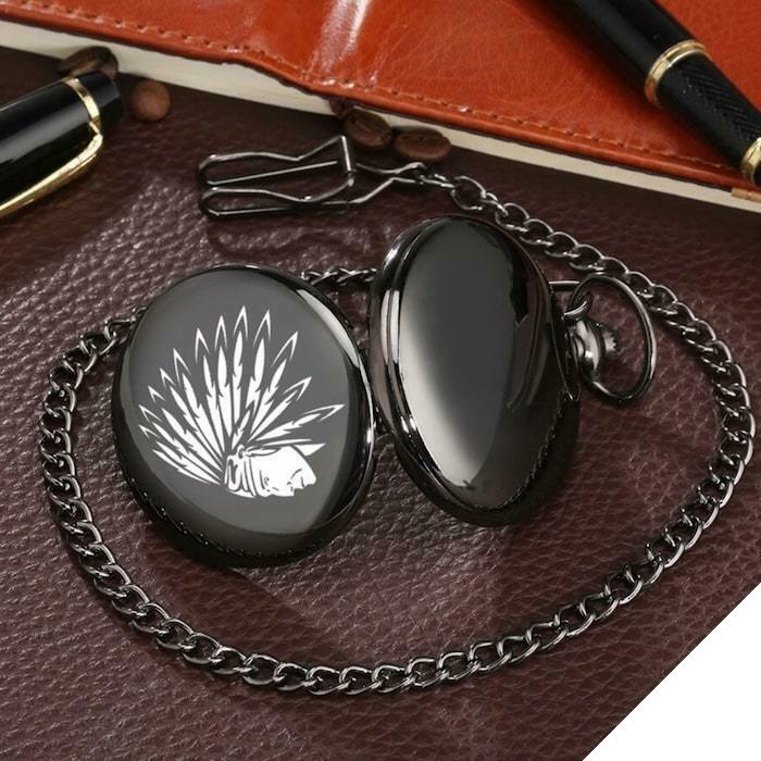 Gents lommeur quartz er en model, der kombinerer moderne stil med passionen for den indianske verden. Denne lommeur er lavet af rustfrit stål og skiller sig ud med sit raffinerede portræt af en Apache-kriger og sit autentiske udseende af urskive.