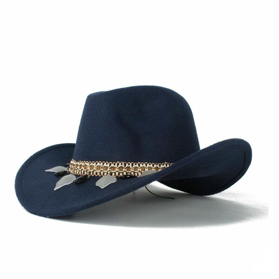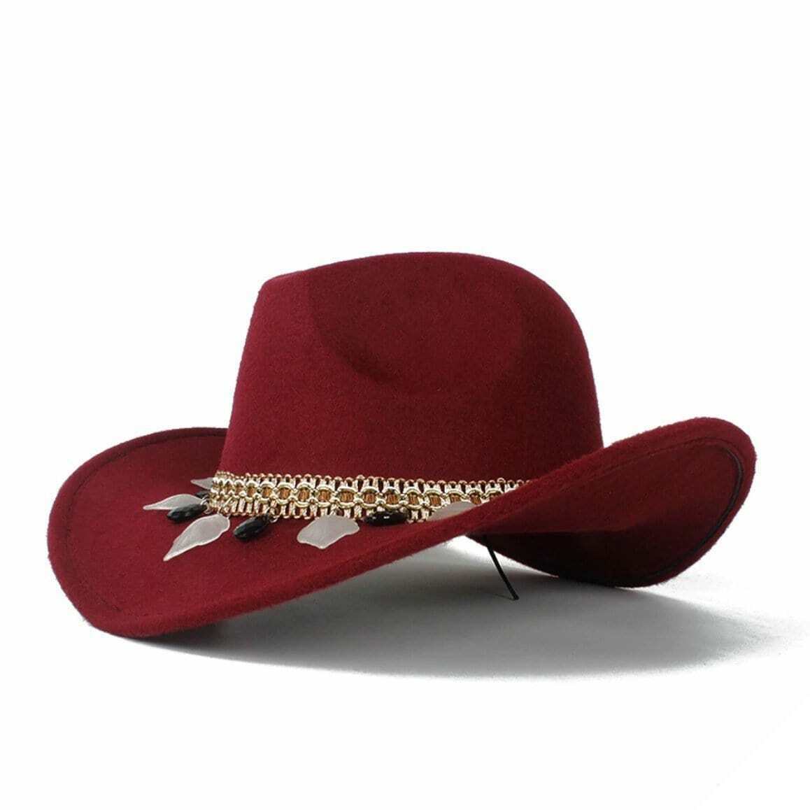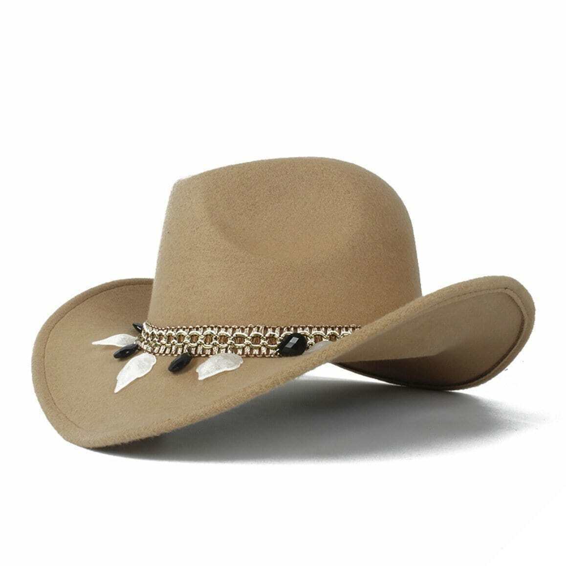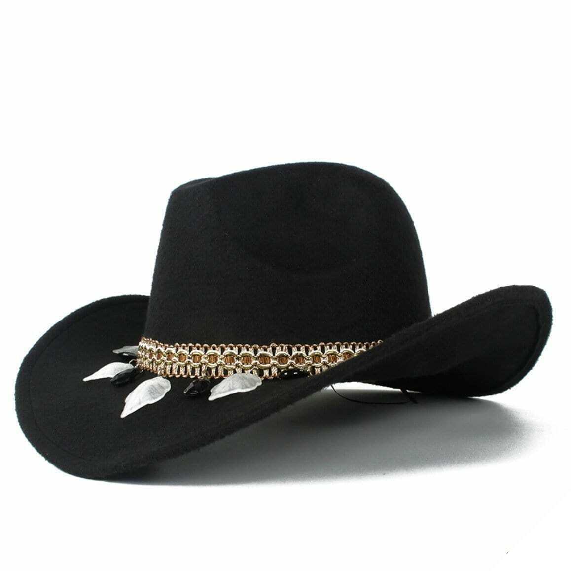 Kvinders Pioneer western hat afspejler harmonisk den amerikanske indianske stil. Den er lavet af høj kvalitet uldfilt og er prydet med et bånd, der repræsenterer rødhudernes verden. En ideel hat til country-elskere.