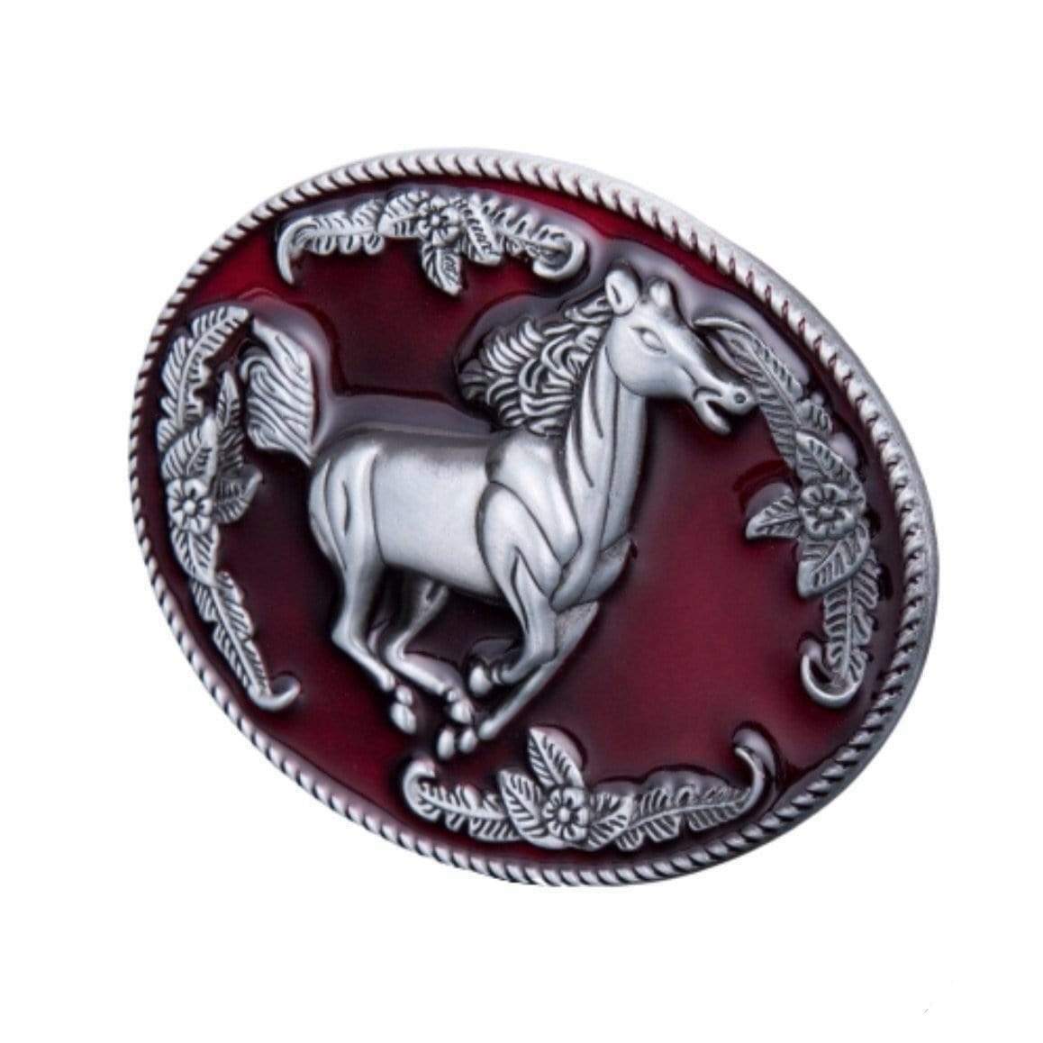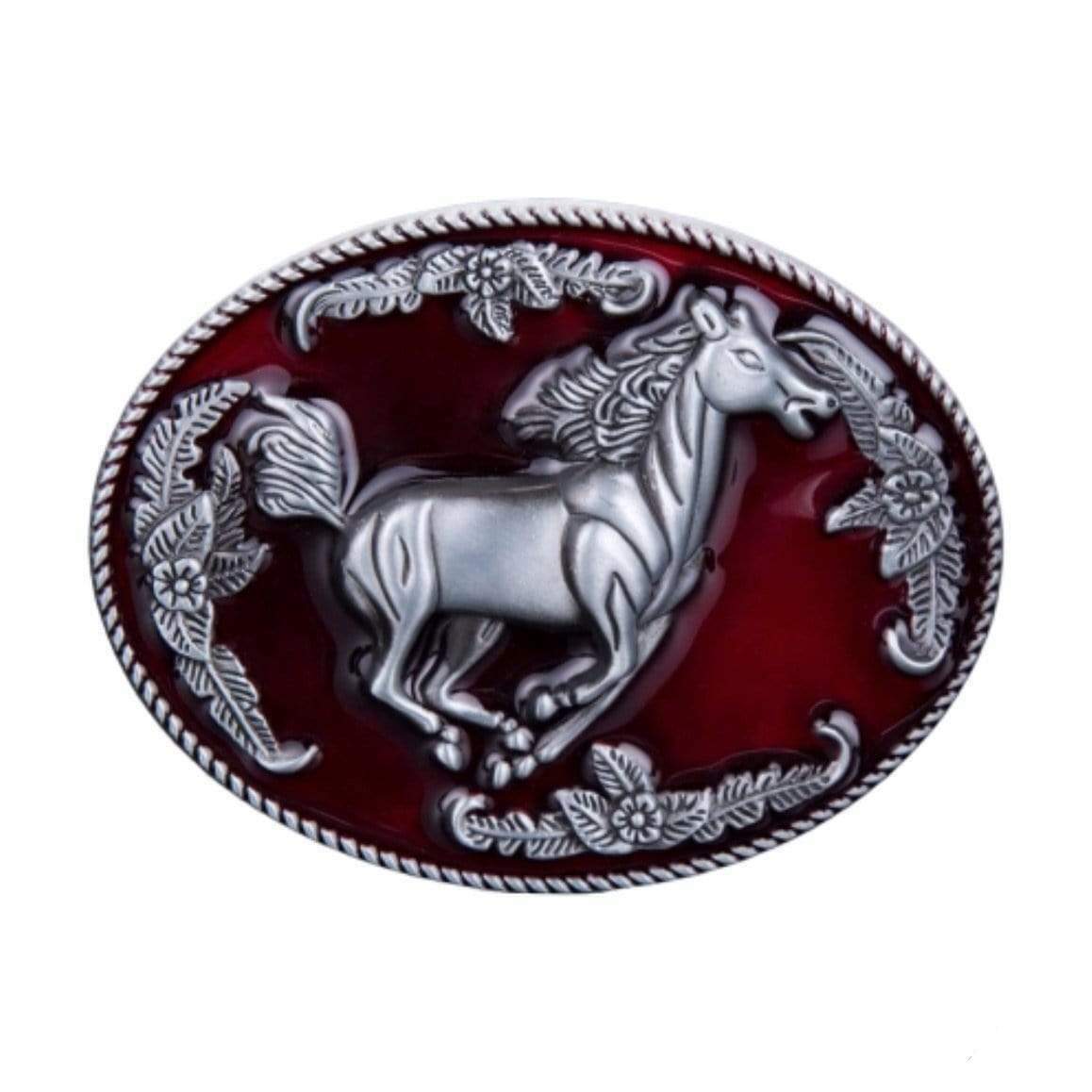 Den cowboy røde bæltespænde løkke giver dig mulighed for at udtrykke din passion for westerns og ridning. Den rubinrøde farve fremhæver cowboyens foretrukne følgesvend.
