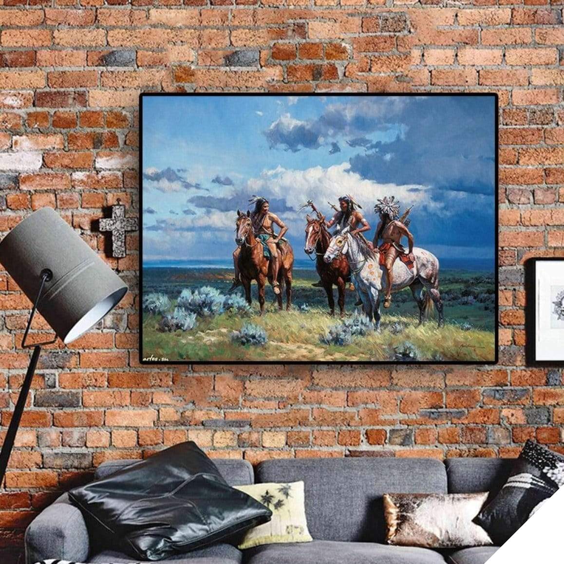 Plains Indians Maleri er en repræsentation af hverdagen for de rødhudede indianere. Dette maleri, med dets sublime farvespil, fremviser mange detaljer og fremhæver de berømte amerikanske indianske heste samt deres traditionelle dragter.