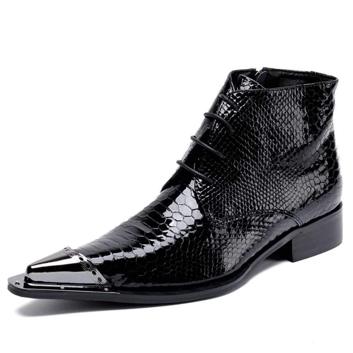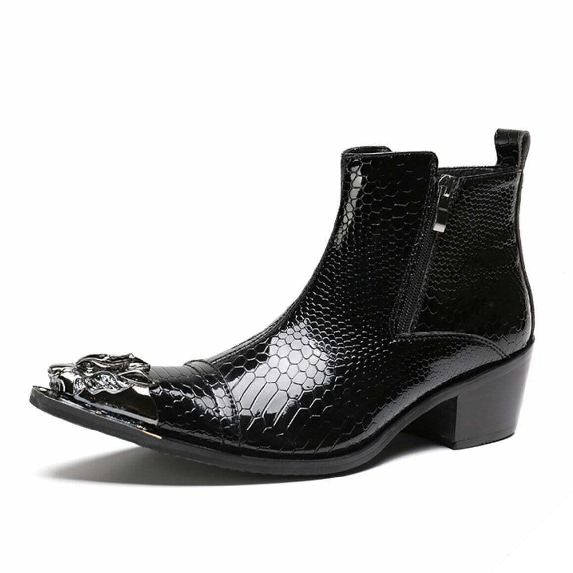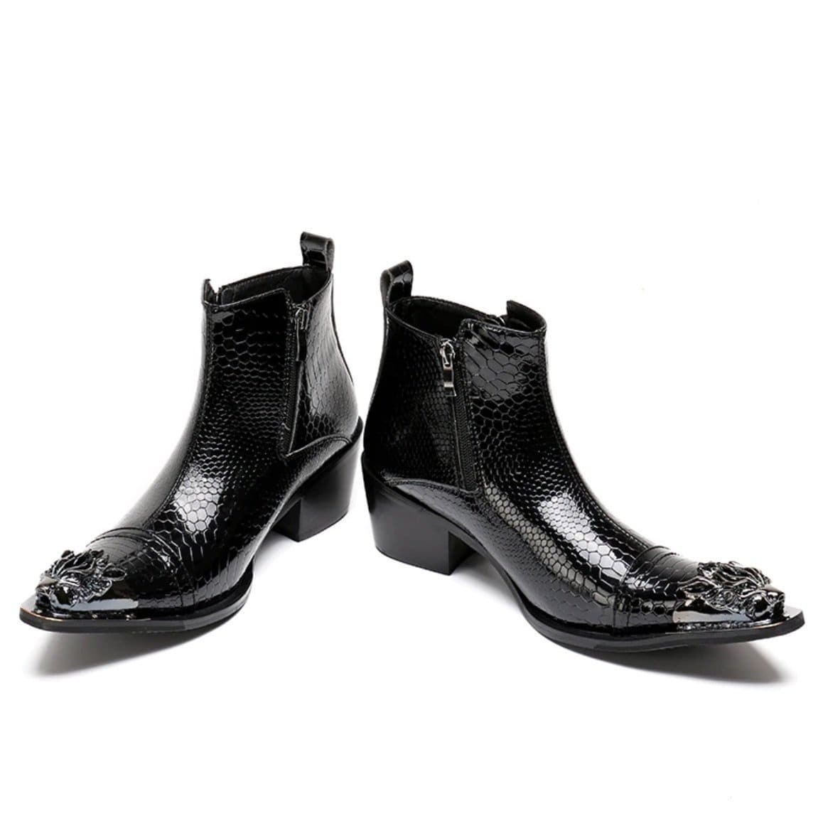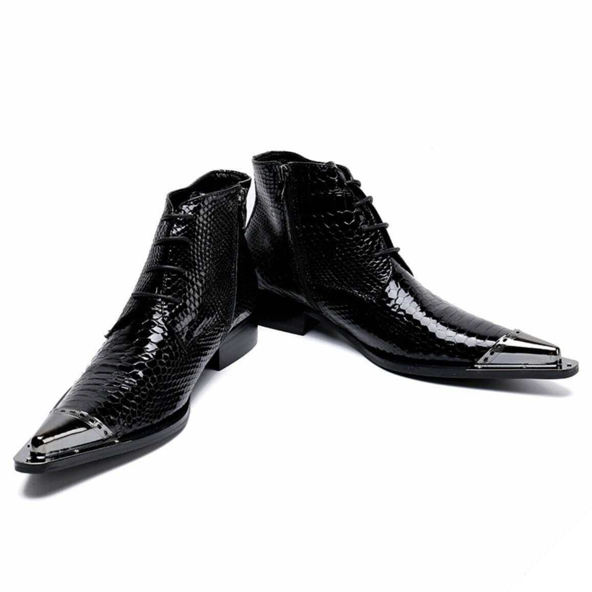 Sorte sorte Western støvler tilfører elegance og en cowboystil. Disse Western støvler er håndlavede af ægte læder af høj kvalitet og skiller sig ud med deres slangeagtige tekstur og metal spids.