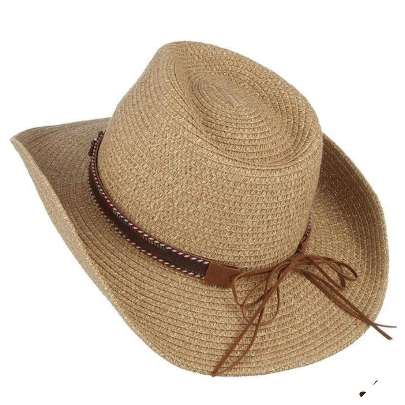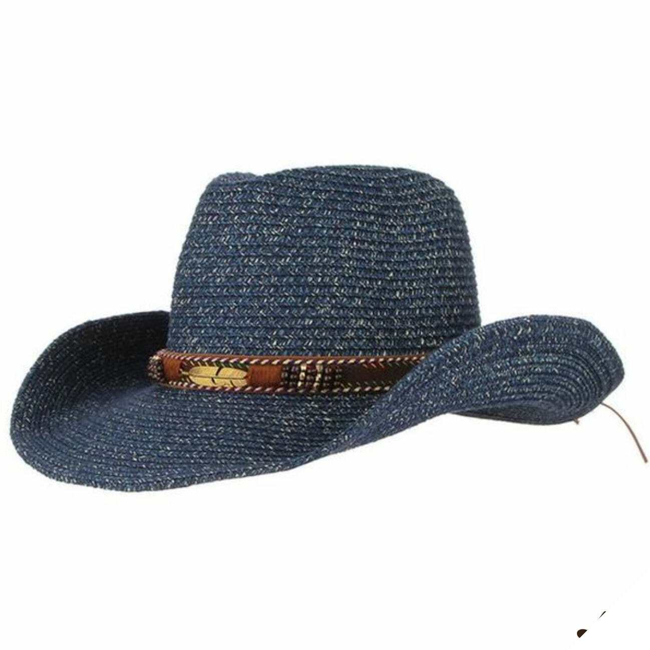 Cowboy halmhatten afspejler cowboyverdenen og det vilde vestlige Amerika. Dens design, naturlige farver og dekorative bånd gør den til en unik hat.