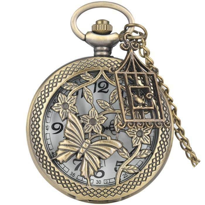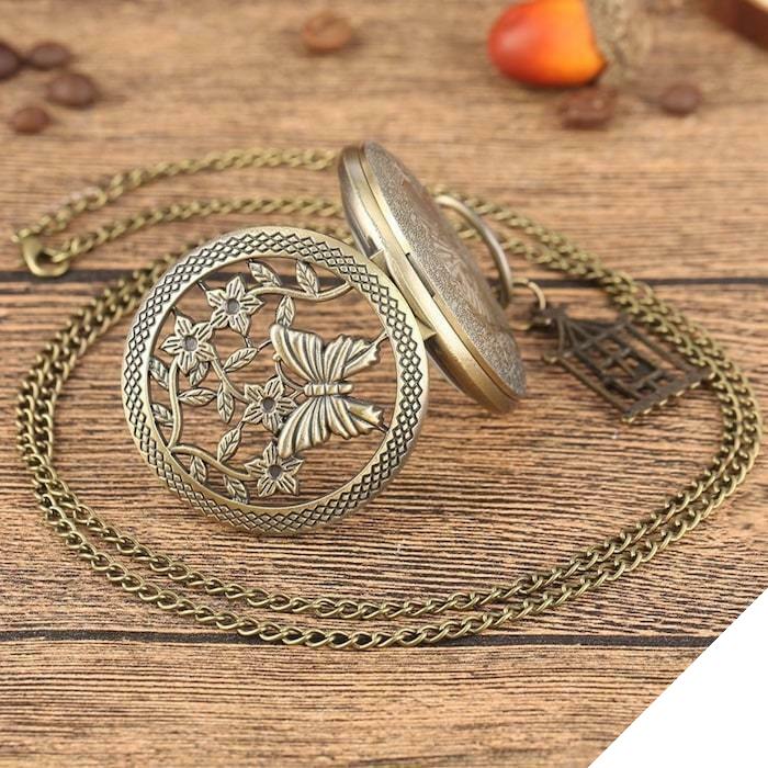 Gammel dame lommeur er et autentisk og originalt ur med et feminint udseende. Den er designet i rustfrit stål og skiller sig ud med sine fine sommerfugle- og blomstermønstre, der garanterer en unik vintageeffekt.
