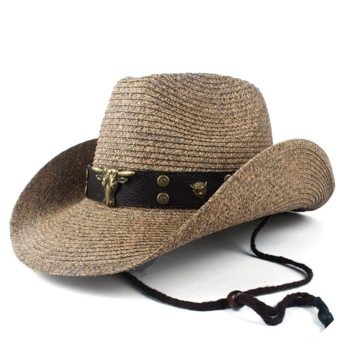 Den vestlige filmhat er en klassiker inden for autentisk cowboy-look. Fremstillet af vintage-stil halm, har den ægte læderrem foran en af symbolerne på Det Vilde Vesten: bisonkraniet.