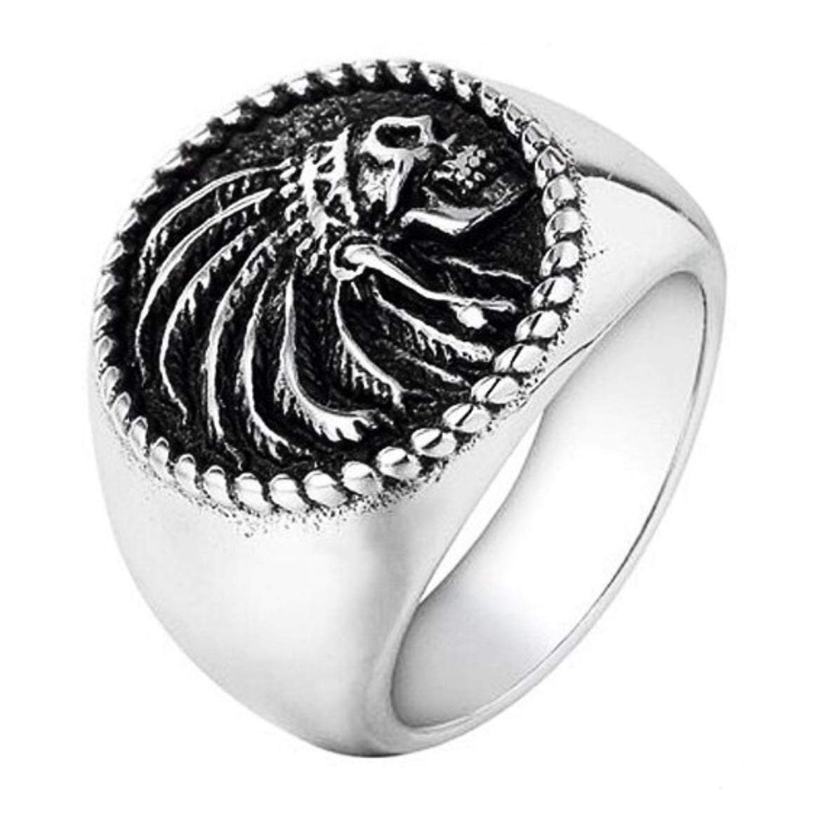 Denne indianske dødningehoved ring er en unik og original model, der repræsenterer den apache verden på en makaber måde. Denne ring med detaljerede finish fremhæver den indianske krigers udsmykning på hans kranium, et uundgåeligt symbol for dødens univers.
