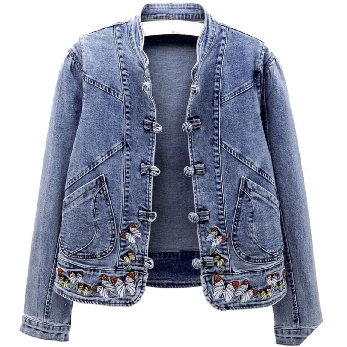 Kvinders westernjakke repræsenterer cowgirl-stilen på bedste vis. Denne uundværlige model lavet af denim skiller sig ud med sine broderede sommerfugle-mønstre, der kombinerer stolthed og elegance med et western-look.