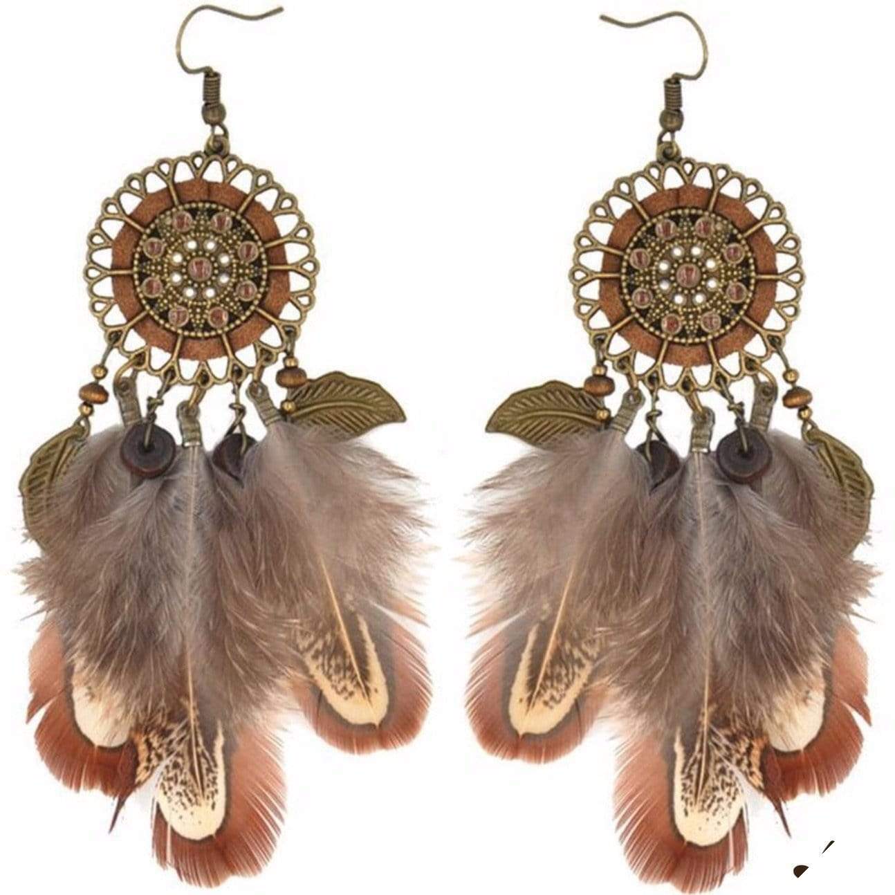 Perfekte til festivalsæsonen, denne par hængende øreringe fremhæver brune fjer, der hænger fra mønstrede ringe og skaber en drømmefanger form.