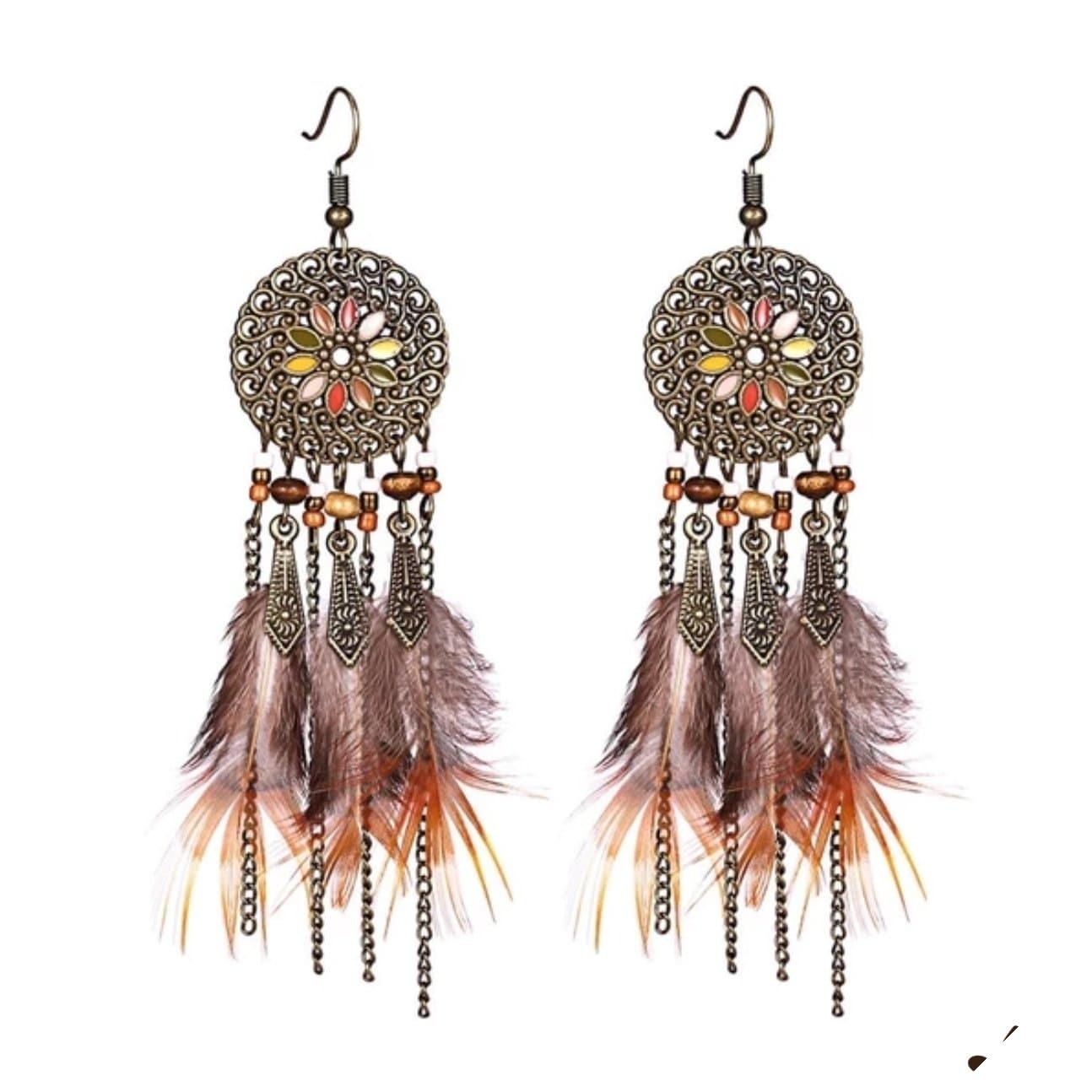 Indian Feathers Øreringe vil glæde alle western- og countryelskere. Disse forfine og elegante øreringe udstråler en unik charme. Perfekte til festival sæsonen, denne hængende øreringe par viser brune fjer blandet med mønstrede cirkler, der skaber en drømme fanger form.
