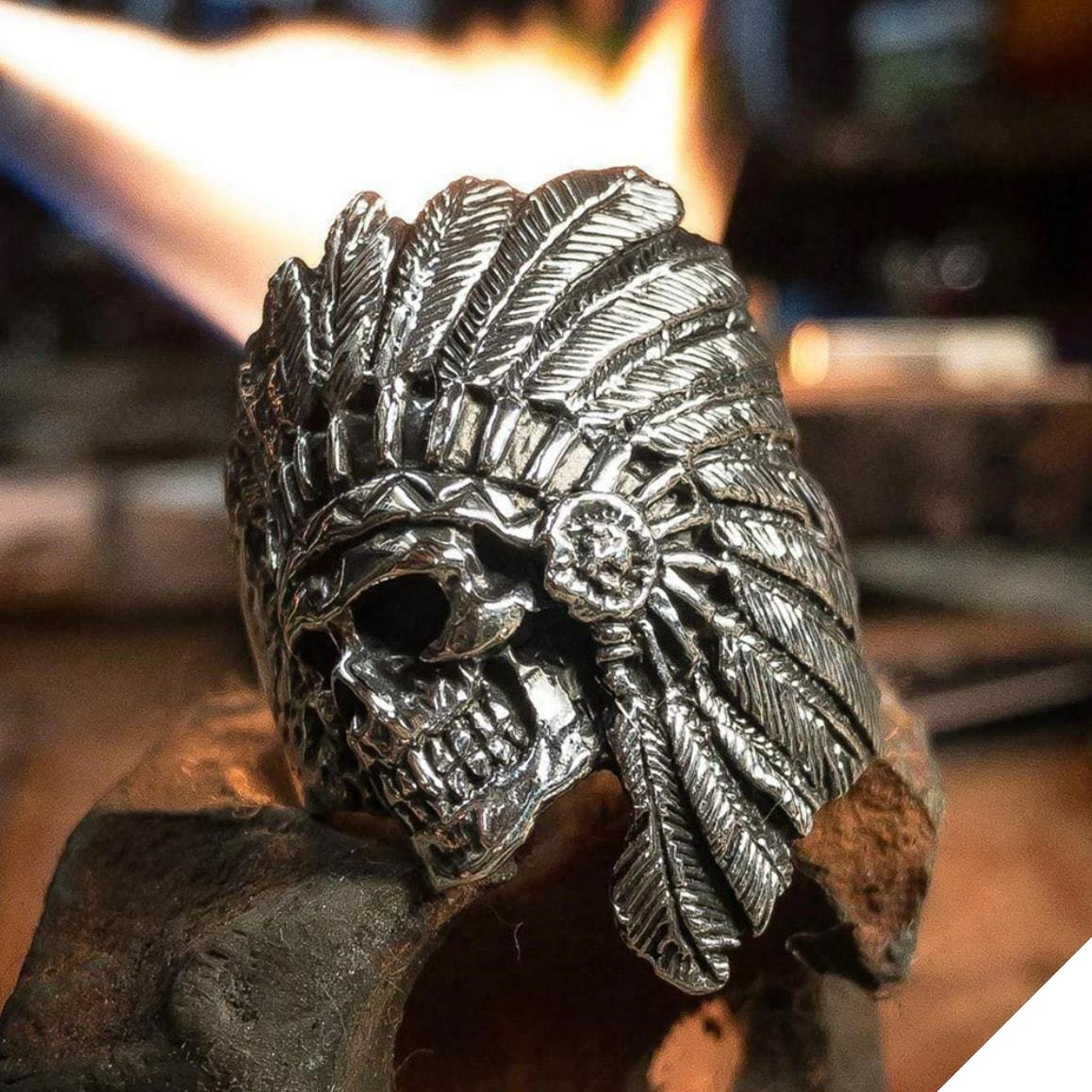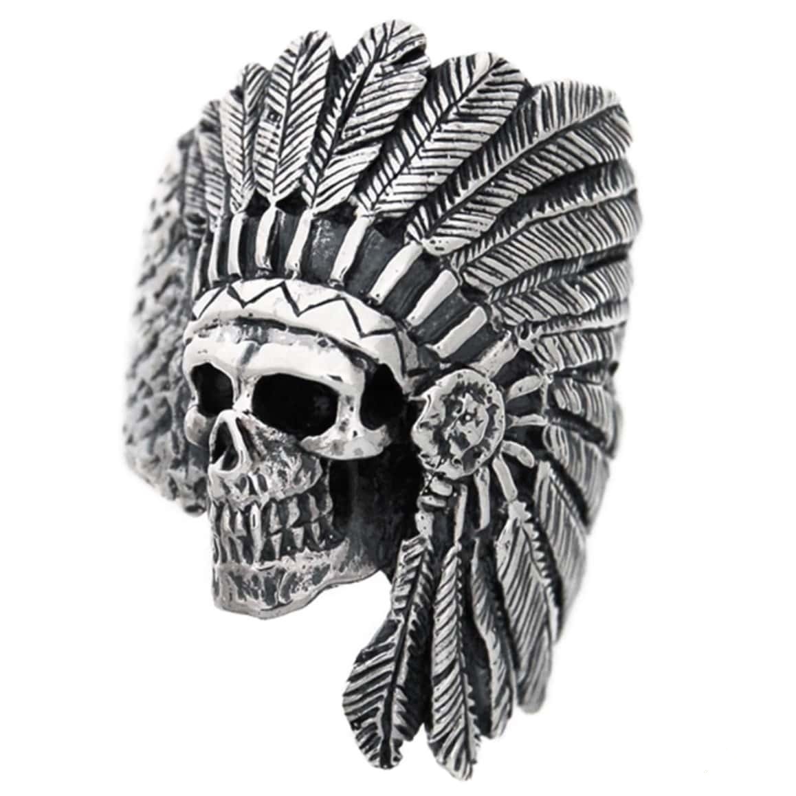 Indianerhovedringen til mænd repræsenterer autentisk den amerikanske indianske verden. Med detaljerede finish fremstiller denne ring et dødningehoved under en indiansk hovedbeklædning, et karakteristisk symbol for den vestlige verden.