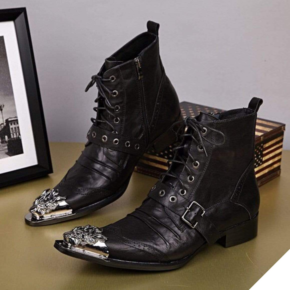 Snørestøvler i westernstil udstråler elegance, maskulinitet og cowboylook. Disse støvler er håndlavet af ægte kvalitetslæder og skiller sig ud med deres sorte farve og karakteristiske metalbeslag.