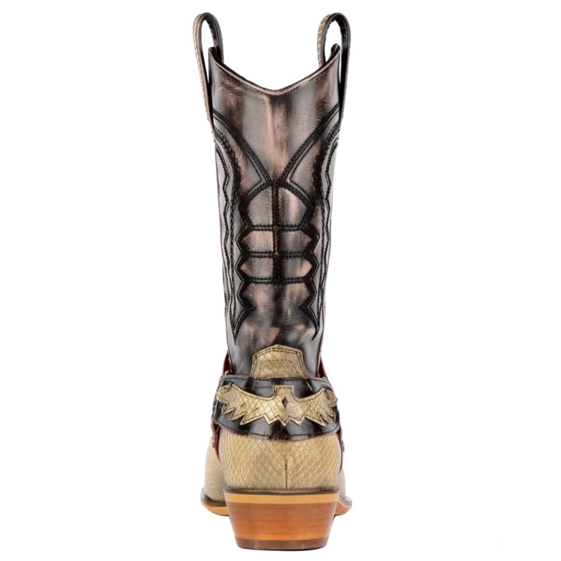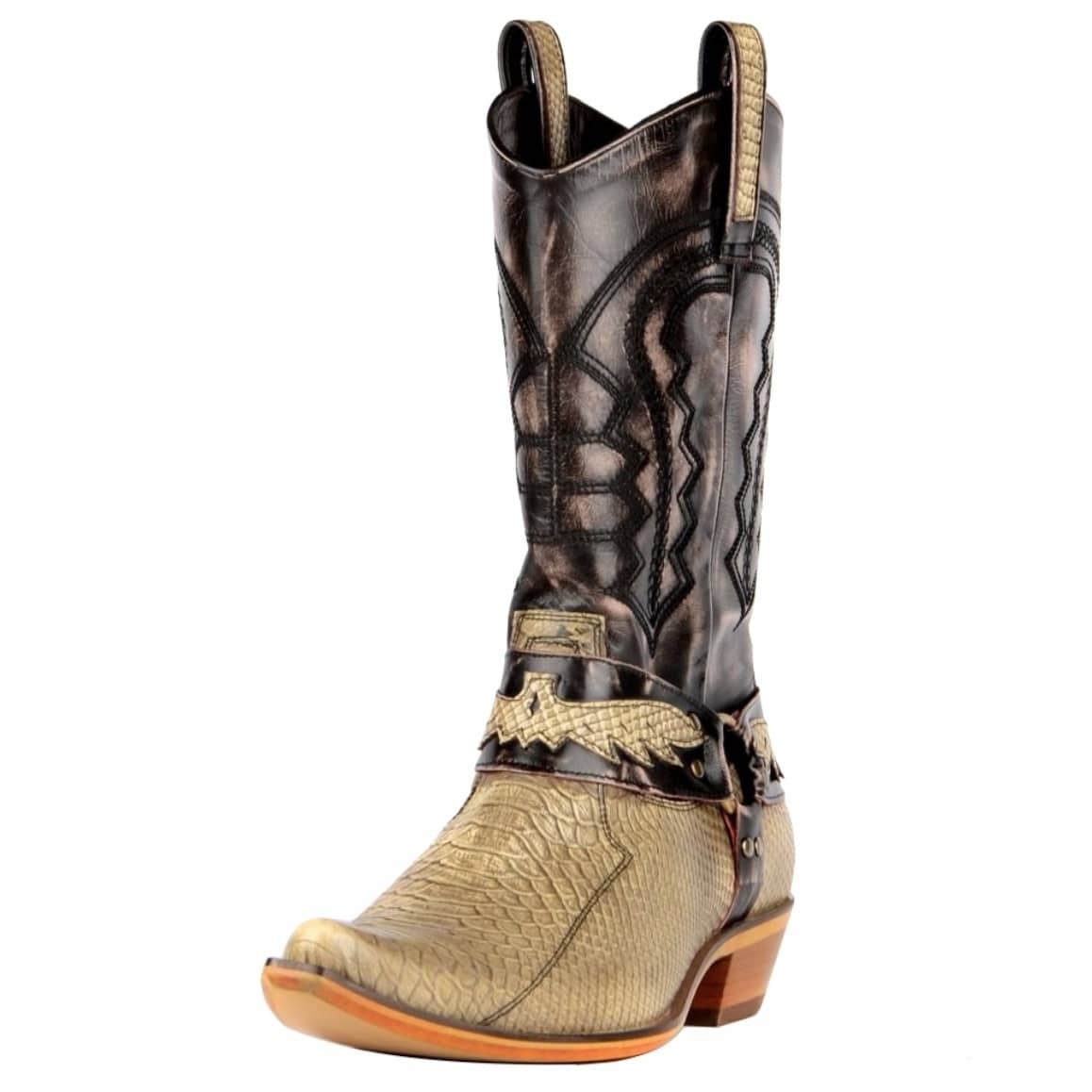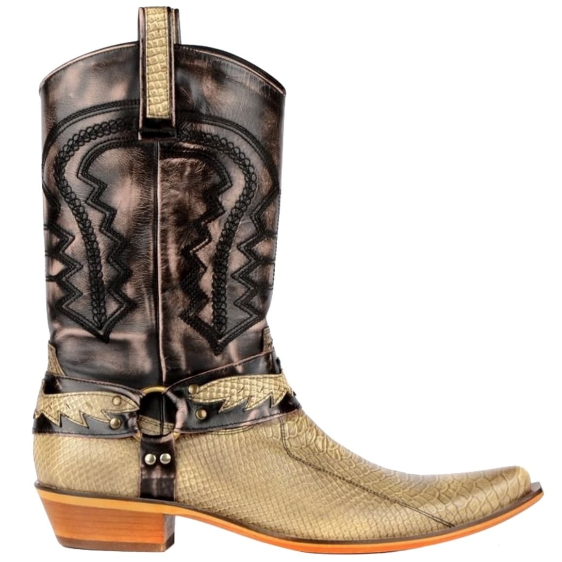 Støvlens top er farvet med nuancer af brun. Oven på det er der en beige farve fra anklen. Derudover er de høje støvler, der når midt på læggen, nemme at trække på for at spare tid. Spidsen og de små hæle passer perfekt til din kropsbygning. Syningerne er perfekt udført for at give en slangeeffekt. Derudover har disse læderstøvler en sølvfarvet indlægning på siden. Disse høje støvler er et uundværligt element i enhver ægte western-aficionados garderobe.