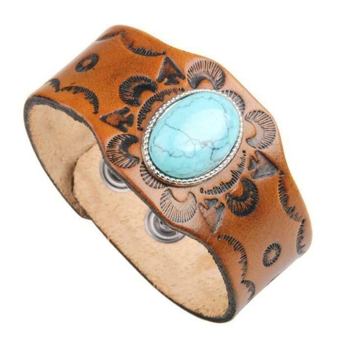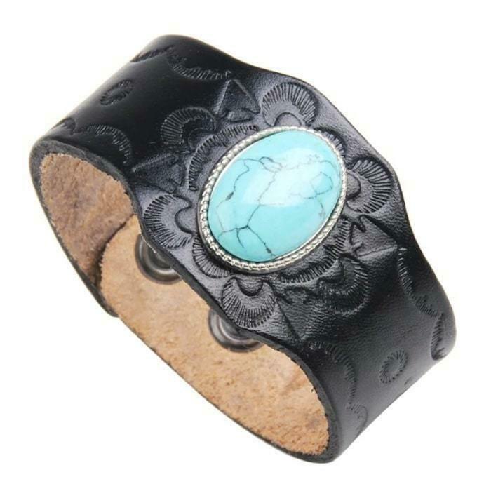 Armbåndet i læder med turkis sten er en unik og autentisk model fra cowboystilen. Lavet af ægte læder af høj kvalitet adskiller det sig ved dets fine læderarbejde og karakteristiske turkisfarve.