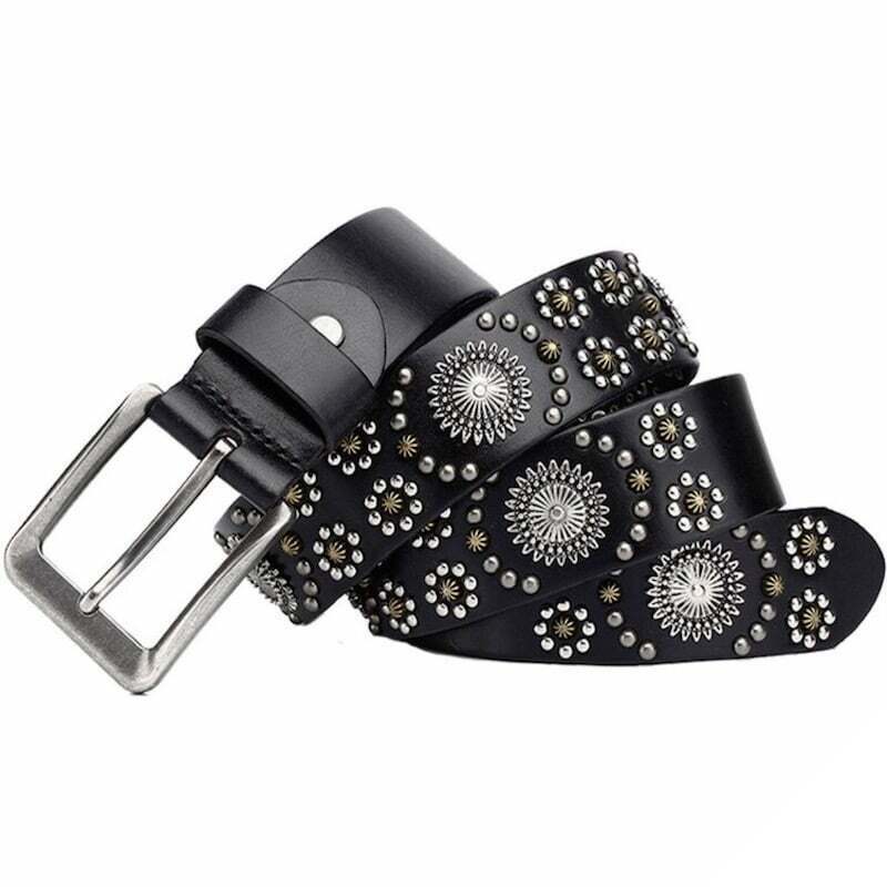 Dette damebælte i sort læder med vestlig stil er designet til de kvinder, der er passionerede om cowgirl-landmiljøet. Det er fremstillet af ægte læder af høj kvalitet og adskiller sig med sine charmerende og feminine conchos.